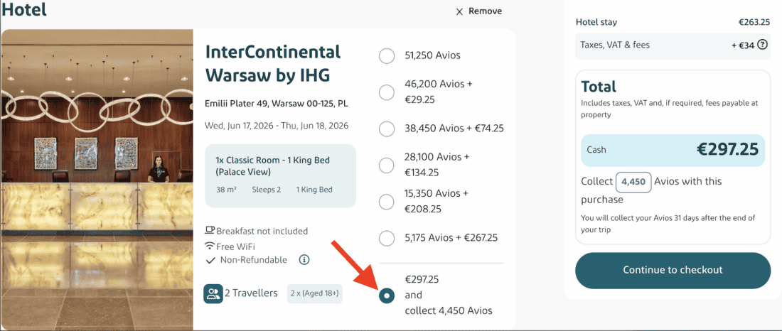 When booking, you must manually select the lowest option to pay the full room price by card and earn Avios. In the following example, you pay €298 including tax and collect 4,450 Avios worth about €60: