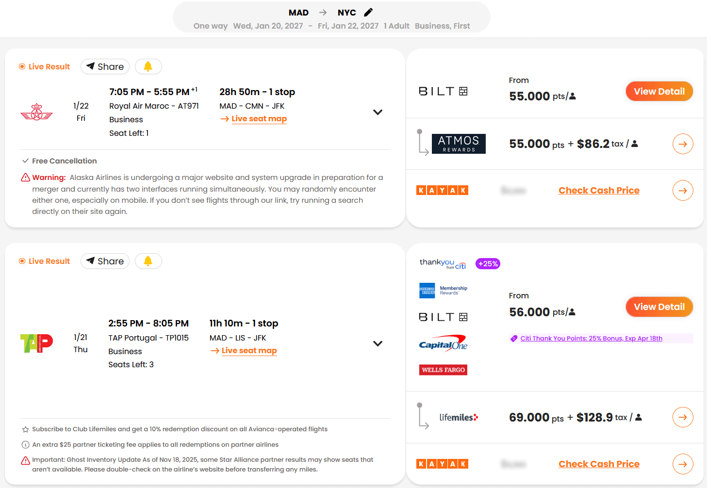 Here is an example search for Madrid – New York on Points.yeah:
