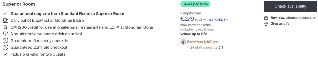 LuxuryEscapes currently has an exceptional offer for the 5-star Mondrian Doha in Qatar. They are charging €289 for 2 nights (approx. €145 per night), including daily buffet breakfast, a QAR 200 (~€47) resort credit, and a guaranteed room upgrade. The only condition is a minimum stay of 2 nights.