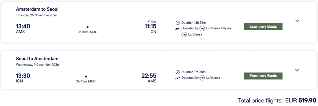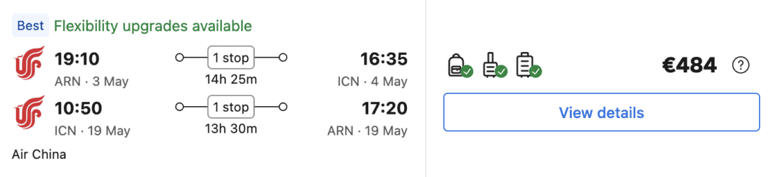 Star Alliance member Air China is selling cheap tickets from Europe to Seoul, starting at only €484 from Stockholm or €497 from London. You’ll first fly to Beijing overnight, and then fly another 2 hours to Seoul. 23 kg of luggage is directly included. The cheapest dates can be found in May 2026.