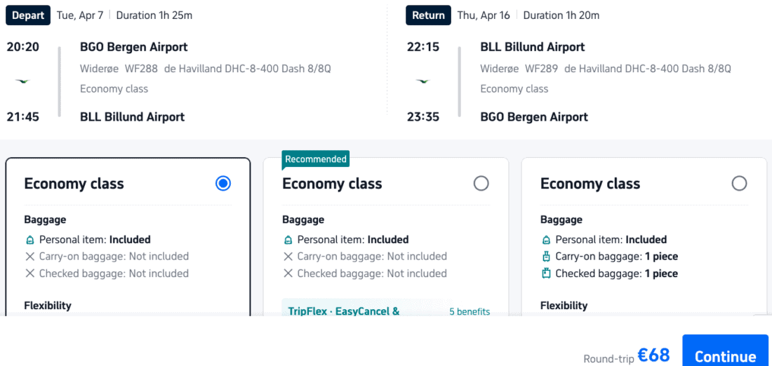 If you want to fly with a personal item, or with both an 8 kg carry-on plus the 23 kg of checked luggage, booking on Trip.com is the cheapest option. If you want to fly merely with 8 kg of hand luggage, the cheapest option is booking the Mini fare on Wideroe’s website and adding the carry-on as an extra.